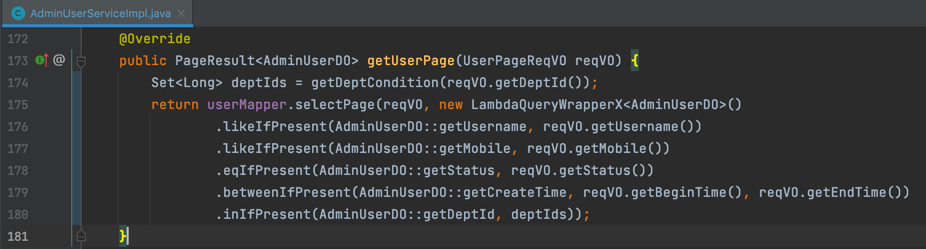 - 【出参】查询后,将 MyBatis Plus 的分页结果 IPage,转换成项目的分页结果 PageResult (opens new window)。代码如下图: