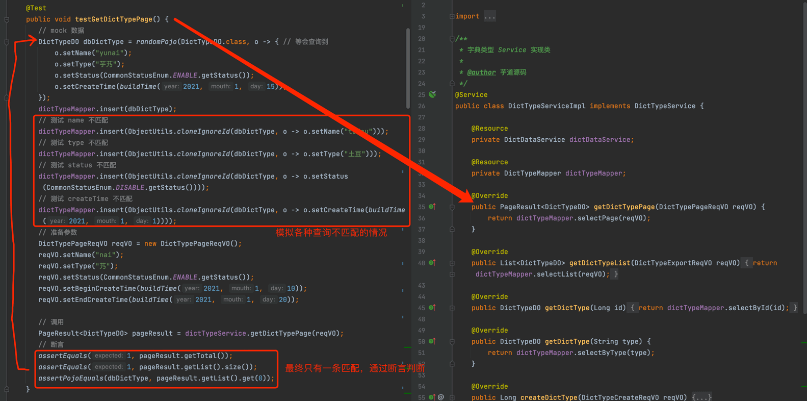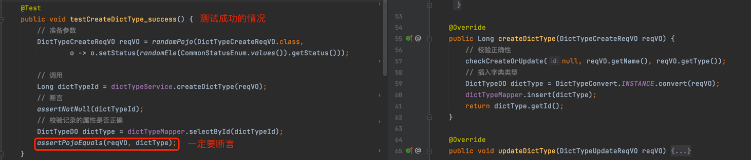 以字典类型模块的 DictTypeServiceImpl (opens new window) 为例子,讲解它的 DictTypeServiceTest (opens new window) 单元测试的编写实现。