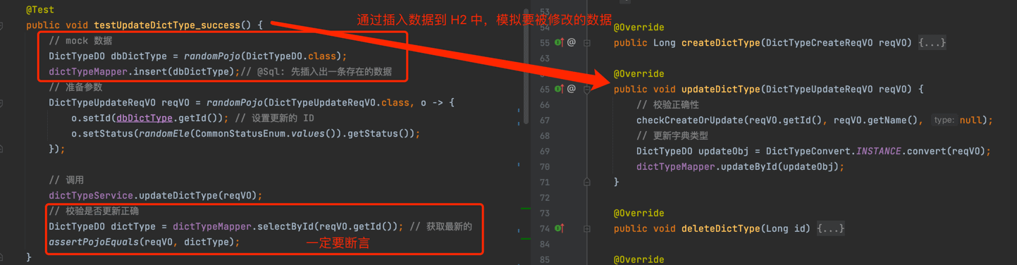 dictTypeMapper某种程度来说,也是一种外部依赖,但是通过内嵌的 H2 内存数据库,进行“真实”的数据库操作,反而单元测试的编写效率更高,效果更好,所以不需要 Mock 掉。