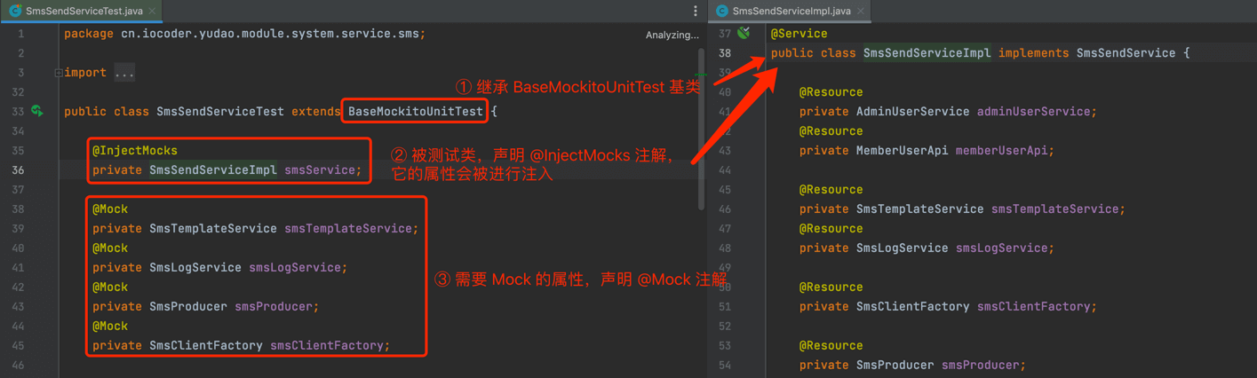 一些类由于不依赖 MySQL 和 Redis,可以通过继承 BaseMockitoUnitTest 基类,实现纯 Mockito 的单元测试。例如说 SmsSendServiceTest (opens new window) 单元测试类,代码如下: